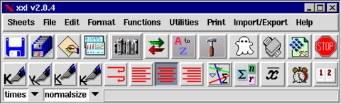 One of the aims of Xxl is to provide a simple usage model by means of a graphical interface. All features of the spreadsheet can be accessed through a control panel, consisting of a bar with buttons, menus and a message area, all controllable by the mouse (see Figure 2). The control panel acts on the current sheet, which can be selected by the “sheets” menu or by a button in the upper left part of each sheet.