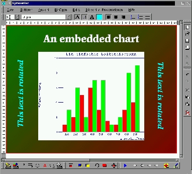 Currently, KOffice consists of the following applications which, as I write, have different levels of usefulness. First, there is KPresenter (see Figure 3), a presentation program in the spirit of MS PowerPoint that has already been used for “real work” (like my KDE presentation at the last International Linux Congress in Cologne) and features a large number of blending effects. Then, there is KSpread (see Figure 4), a spreadsheet that already contains about 20% of the functionality of MS Excel and is easily extensible via scripts written in Python.