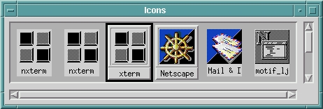 The UseIconBox default is false which means when you minimize a window, its icon appears in the root window. Setting the UseIconBox to true creates an MWM window which holds the icons. See Figure 1 for an example of an icon box. The dark black line around the xterm icon indicates that the xterm window has the focus. The frame around the Netscape icon indicates that it is iconized, and the lack of frames around the nxterms, Mail and nedit icons indicates that the windows are not iconized.