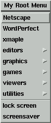 Let's take a look at the .mwmrc file. Listing 1 is a portion of my modified .mwmrc file copied from system.mwmrc. The complete file can be found in the archive file ftp://ftp.linuxjournal.com/pub/lj/listings/issue61/3218.tgz. Make sure to enclose your items in exclamation points if they contain spaces. Mnemonics and accelerators are optional. Mnemonics are one of the letters in the item which should appear underlined. Once the menu is chosen, typing the mnemonic is the same as clicking on the item. An accelerator is a series of keystrokes for accomplishing the function without using the menu at all. Functions include titles, exec, separator and menu. Titles are the titles in the menu (see Figure 2), and separators draw a line in the menu. The program you want to start is lauched by exec. You can specify the full path name of the program or just its name, if your path variable is set correctly. Menus are the sublevel menus. For example, I've created a menu item “games” and the name of the menu is Games Menu. Then, later in the listing, you have the definition for the Games Menu. Customizing your environment in Motif is easy and fun.