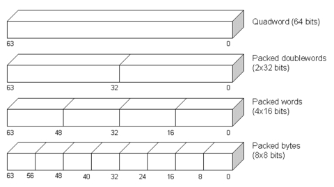 The MMX technology extends the Intel architecture by adding eight 64-bit registers and 57 instructions. The new registers are named MM0 to MM7 (see Figure 1). Depending on which instructions we use, each register may be interpreted as one 64-bit quadword, two packed 32-bit double words, four packed 16-bit words, or eight packed 8-bit bytes (see Figure 2).
