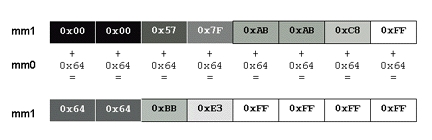 MMX technology allows us to do this saturated arithmetic addition on eight unsigned bytes in parallel using just one instruction: paddusb. Figure 6 shows an example of how this instruction works. Our image-brightening algorithm (see Listing 1, starting at line 61) can be described as follows: