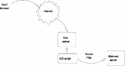 MiniVend is a client/server system. The browser talks with a small application that in turn talks with the MiniVend server through a socket. For this reason, you don't have to load the MiniVend server for each user session, which might overload the system.
