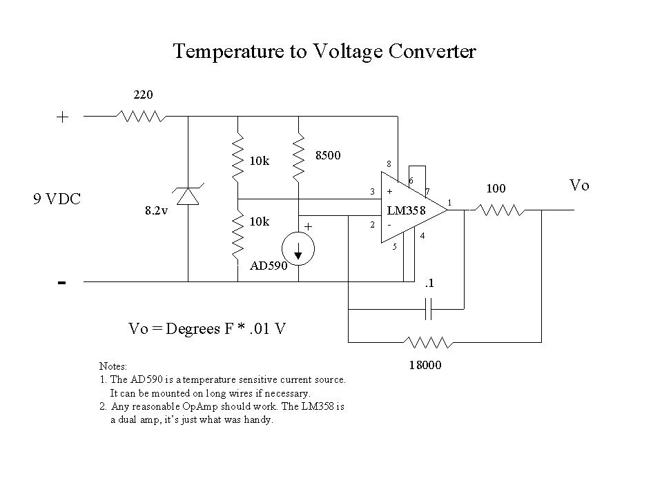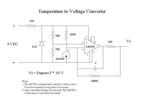 A little research on the Net turned up a couple of thermocouple to millivolt converters, but they cost much more than I wanted to pay. Being an electrical engineer and having worked at a measurement company for many years, I knew that a temperature to volts converter circuit is fairly simple. A couple of friends helped out by putting together a circuit that provides .01 volts out per degree Fahrenheit that fits on a piece of vector board about an inch square and runs from a 9-volt battery. See Figures 1 and 2 for the schematic diagram and a picture.