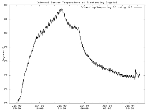 I have been doing a fair amount of testing and monitoring on the system and hardware clocks of my Debian 2.0 machine that I use for file (Samba), communication (ISDN/masq/diald), printing and modem pool (mserver) service on my home office network. I wanted to see how well I could correct the system clock with adjtimex without running ntpd all the time and keeping the ISDN line to my ISP up. I had been recording daily data for the clocks and an ntp (network time protocol) reference server using the logging feature of adjtimex with cron and an Expect script. I was noticing some odd changes from day to day, and was beginning to wonder if temperature was affecting the server's system clock.