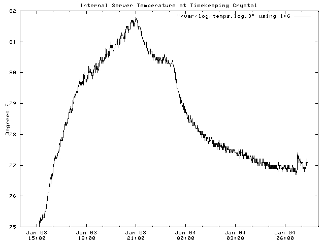set xdata time set format x "%b %d\n%H:%M" set title "Internal Server Temperature at Timekeeping Crystal" set timefmt "%b %d %H:%M:%S" set xrange [ "Jan 03 14:00:00" : "Jan 04 07:59:00"] set ylabel "Degrees F" -2 plot "/var/log/temps.log" using 1:6 with lines 1The xdata and timefmt directives tell gnuplot the horizontal axis is measured in time and how the times in the log file look. The xrange directive determines which lines of the log file get plotted. The format x directive defines the labels on the x axis; the \n between the date and time forces a two-line label. The plot command tells gnuplot where to find the log file, which columns to plot and to use line plot style 1. The set title and set ylabel put a title and y-axis label on the plot.