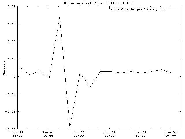 set xdata time set timefmt "%Y-%m-%d %H:%M" set xrange ["1999-01-03 15:00":"1999-01-04 07:00"] set format x "%b %d\n%H:%M" set title "Delta sysclock Minus Delta refclock" set ylabel "Seconds" -2 plot "/root/clk_hr.prn" using 1:3 with lines 1