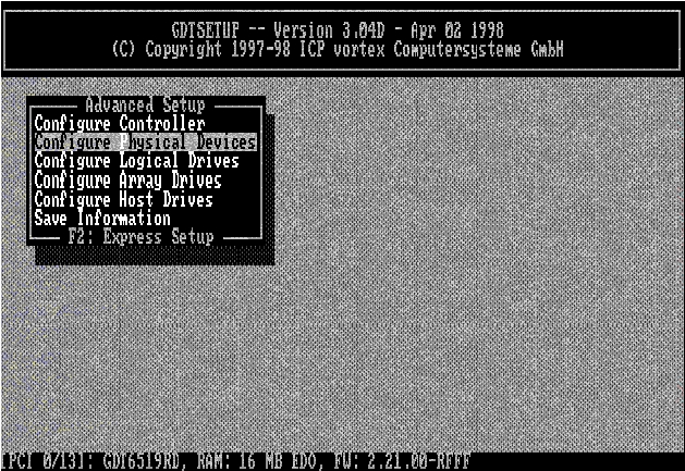 Once the array was configured, the GDT controller started building the array, i.e., building the checksum blocks. I interrupted this process to reboot into the Red Hat 5.2 installation routine. I discovered the ICP does not present a SCSI CD-ROM hooked to its Narrow SCSI port as a bootable device to the BIOS. Swapping to an IDE CD-ROM solved that problem.