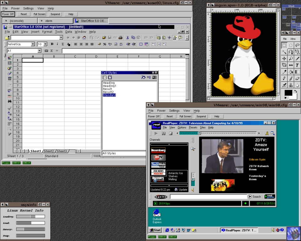 Next, I loaded Caldera, SuSE, Windows 95 and even Windows NT Terminal Server. All of these operating systems loaded without any problem, and I used the wonderful documentation to get the virtual sound and network cards working. Finally, I moved my installations over to a better-equipped PC, a dual Celeron 300a clocked at 450MHz with 256MB of RAM and a 13GB hard drive. Since the VMs appear the same on all hosts, I was able to copy my previous installs over to the bigger PC. With the addition of power and memory, I was able to run most of these operating systems simultaneously with ample performance in each (which was good, since Windows NT Terminal Server is a resource hog). Probably the best example of performance was when I started compiling the 2.2.5 Linux kernel on my host PC, started another kernel compile on a VM running SuSE, and viewed a RealVideo clip playing in Windows 95 on a VM. The sound and video never skipped a beat.