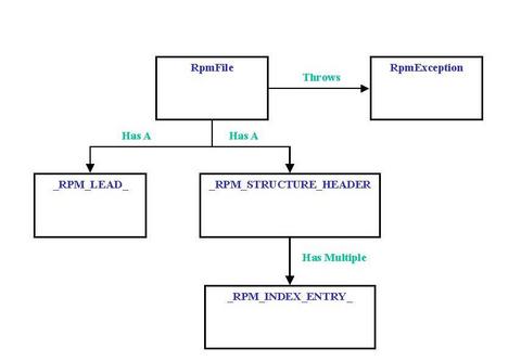 Figure 2 represents the structure of the Java RPM class designs in UML format (Unified Modeling Language). Let's explain it in more detail. The UML class design provides a clean high-level representation of what an RPM package is.