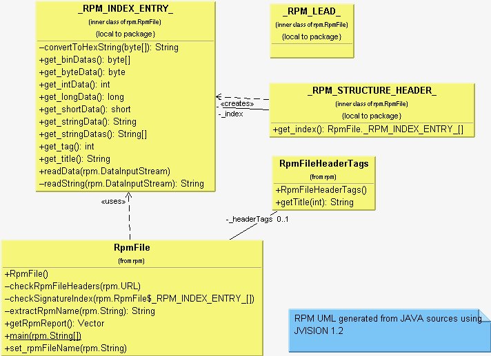 Once the _RPM_LEAD_ has been validated, the RpmFile class instantiates an _RPM_STRUCTURE_HEADER_ class, which is used to check the RPM file header content. The header content consists of multiple _RPM_INDEX_ENTRY_ stored in an internal array. Each element of this array represents a piece of header information which will be made available later via the get_rpmReport method. Since there is no reason to make those classes visible to mere mortals outside the RpmFile, they have been implemented as internal Java Classes inside the RpmFile class. A more precise UML graph is provided in Figure 3. I used the JVision 1.2 tool to automatically generate the UML class diagram from the Java source code. JVision is a very interesting, easy-to-use tool from Object Insight (https://www.object-insight.com/). This tool is able to automatically generate UML diagrams from Java source classes. Although not free, the license price is reasonable compared to other products. I have been using it for more than one year now, and it helps me in producing Java project documentation. A Linux beta version (free for non-commercial use) of the product is available on the Object Insight web site.