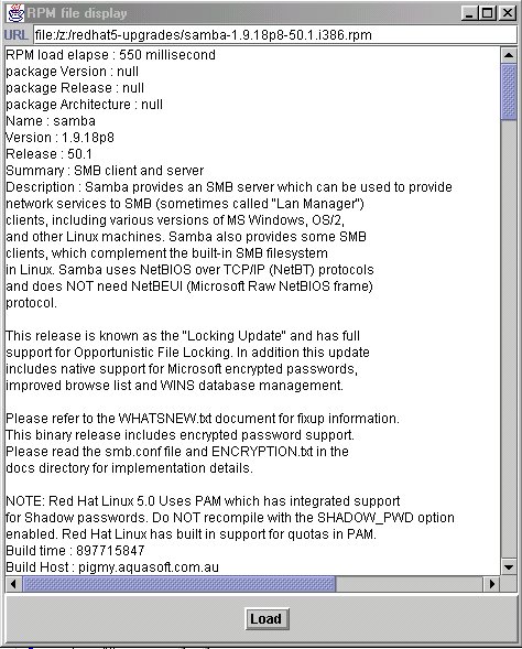 button bar containing a “load” button, which proceeds with the URL RPM file loading Let's now explain how the GUI interface RpmFilePanel Java class interacts with the RpmFile class.