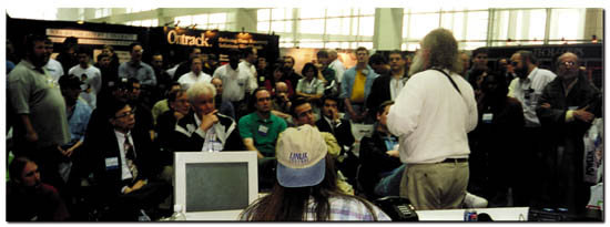 Linux Journal and Linux International sponsored an impressive pavilion and theater, with informative presentations from companies such as Caldera, Cygnus and the always entertaining “BRU Guys”. Also presenting was Jon “maddog” Hall, who wasted no time in challenging the FUD (fear, uncertainty and doubt) that was leaching from the Microsoft area of the show. All of these talks were broadcast live on “The Linux Show”, an Internet-based radio show about Linux (https://www.ttalk.com/). Linus Torvalds drew an enthusiastic crowd of at least 300 while being interviewed by Jeff Gerhardt, host of “The Linux Show”. Kudos to Jeff for asking Linus to autograph his Linux Journal hat.