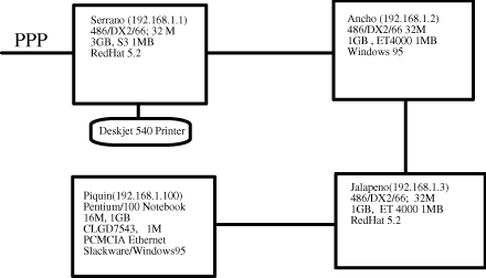 The Linux machine serrano is the file and print server for the Windows 95 and Linux clients, and connects to the outside world through a PPP dial-up connection. It also acts as a firewall; all other machines can reach the outside world through it. The CD-ROM drive on serrano is also available to the other machines on the network.