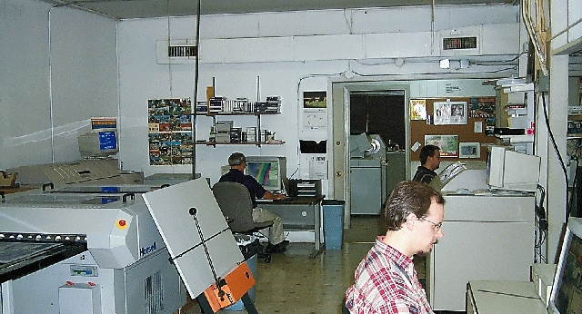 Figure 1. The Imposition and Output department. From left, Jimmy Carman, Jason Clifton and Doug Wilson flight check, impose and output to plate all sheetfed print work at Mahaffeys'. The tan machines with monitors atop at the left and right of the photo are Presstek thermal computer-to-plate imagers.