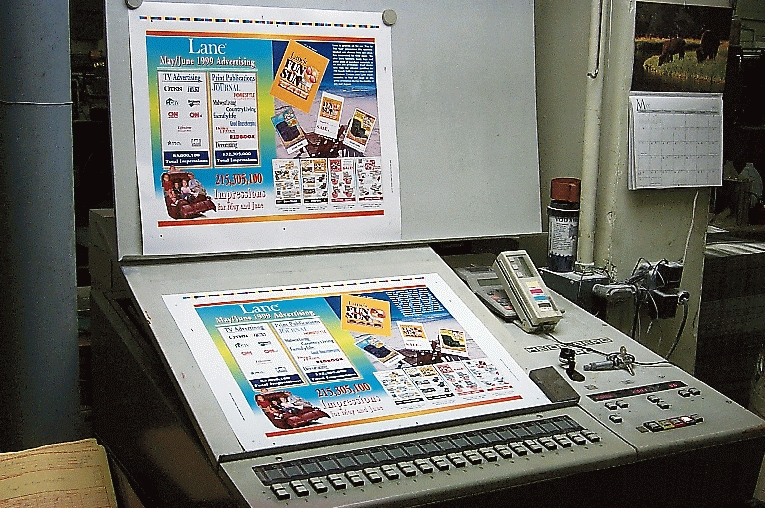 Figure 2. The operator console of the five color Heidelberg MOF offset press shows a process color newsletter being produced for furniture manufacturer Lane. This two-sided 17x22 product exceeded 500MB in size.