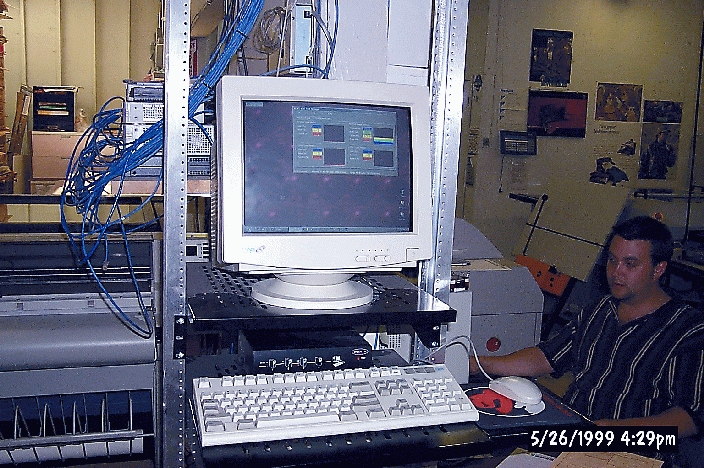 Figure 5. This Rack houses three computers. Two are Harlequin RIP that drive the Presstek platesetters and Quickmaster DI. The third is an SMP Intel machine running SuSE Linux 6.1 that houses Quality's web site (https://www.qualityprinting.com/), e-mail, FTP, DNS and proxy server for the company LAN. The network switches, T1 and DSL routers are seen behind the monitor. Pre-Press Manager Jason Clifton is shown at right.