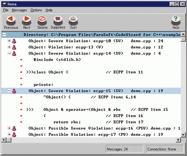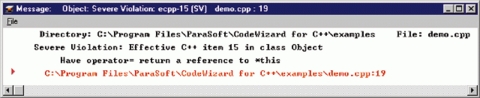 What kind of rules are we talking about? First of all, the items have each been given a rating according to the severity of the rule. The five ratings, from least serious to fatal, are: Informational, Possible Violation, Violation, Possible Severe Violation and Severe Violation (see Figure 1). An example of an Informational rule is item 2 under the Effective C++ list: “Prefer iostream.h to stdio.h.” So, for instance, if you include stdio.h in your code, one of the warnings that will come up will explain that you shouldn't use stdio.h when coding in C++ (see Figure 2). A Possible Violation is rule #17: “Check for assignment to self in operator=.” Item #22 catalogs a Violation: “Pass and return objects by reference instead of by value.” A Possible Severe Violation is something like, “Don't try to return a reference when you must return an object.” Severe violations can prove to be fatal to your program. Rule #10 is a good example: “Write delete if you write new.” Seems obvious, of course, but you may forget it and thus cause ugly memory leaks. The items are divided into different categories, such as “Shifting from C to C++”, “Memory Management” and “Inheritance and Object-Oriented Design”.