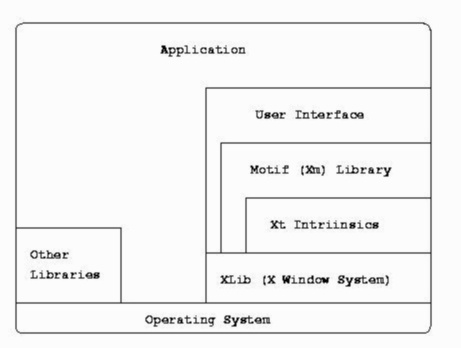 As illustrated in Figure 1, the application may interact with all layers of the windowing system, the operating system and other libraries as needed. On the other hand, the user interface portion of the application should restrict itself to the Motif, Xt and Xlib libraries whenever possible.