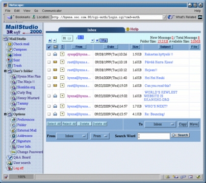 The uniform user interface offers a number of traditional e-mail features, such as mailboxes and address books, as well as some things which are quite modern (or even trendy), such as the ability to send e-mail as HTML with italics and graphics and all of that bother. (This tends to annoy people, actually.) By default, MailStudio keeps Inbox, Sent and Trash folders, and you can apparently add as many as you like, which will be kept in the user's folder menu. The Options folder contains entries for changing your preferences, folders, external mail configuration (for POP3 servers), address book, signature, user information and password. There is also a Question & Answer board for the system and a User Search function for finding others. The last option is “Log off” which kills the encrypted cookies used for user authentication.