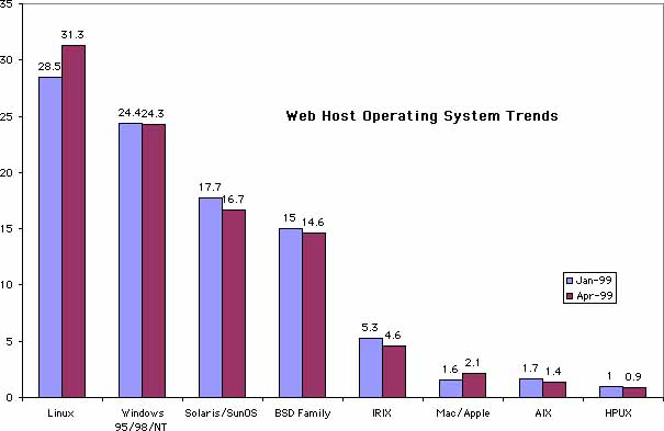 Gains by Linux are old (if not Red) hat by now. Still, it's gratifying to see the numbers. Here are the latest (April 1999) from The Internet Operating System Counter (https://leb.net/hzo/) in graphical form.