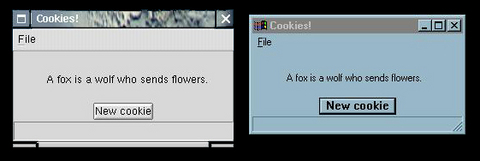 The more interesting points of this “toy” application are how window layout can be achieved (using wxBoxSizer) and how events and widgets are connected (using EVT_MENU and EVT_BUTTON in this case). In fact, as it is, only the layout of the button is satisfactory; the main text is still in a fixed position—a complete solution would be too long to show here.