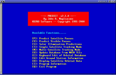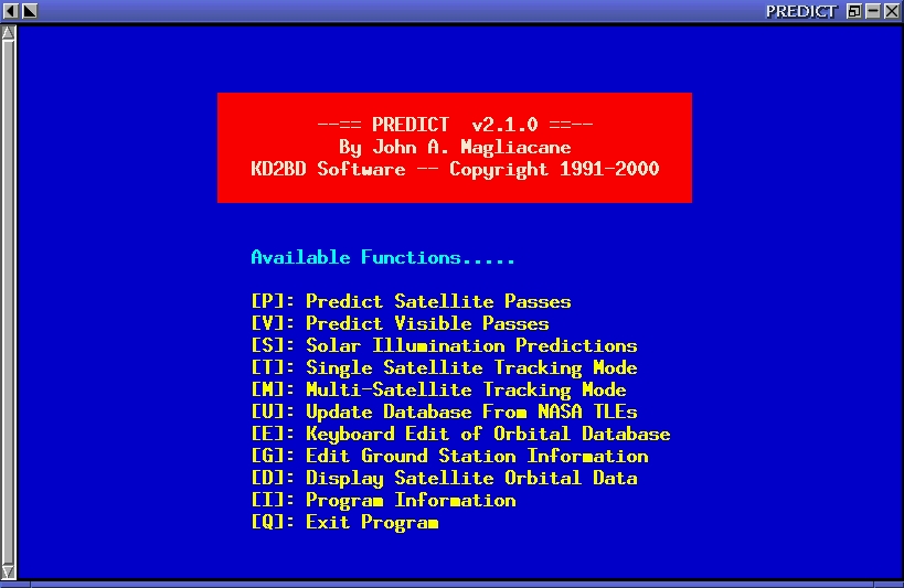 PREDICT is a text-based program, and its start-up screen (see Figure 1) lists all of the program's main functions. Several tracking and orbital-prediction modes are available, as well as several utilities to manage the program's orbital database.