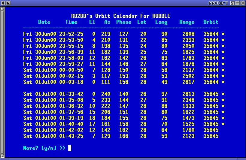 PREDICT includes two orbital-prediction modes to predict any pass above a ground station, or list only those passes that might be visible to a ground station through optical means. In either case, predictions will not be attempted for satellites that can never rise above the ground station's horizon, for satellites in geostationary orbits, or satellites that appear to have decayed in the earth's atmosphere since the last Keplerian orbital data update. If a satellite is in range at the starting date and time specified, PREDICT will adjust the starting date back in time until the point of AOS, so that the prediction screen displays the pass in its entirety from beginning to end. Figure 2 shows the orbital prediction mode of several passes of the Hubble Space Telescope in range of New Jersey in early July, 1999.