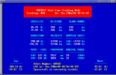 Since PREDICT also tracks the sun and moon in real time, the sky locations of these celestial objects can be used to determine geographical bearings at the user's location. This information is particularly helpful in accurately aligning directive antenna systems to known directions prior to tracking satellites. Since PREDICT also tracks the position of the sun and earth with respect to satellites tracked by the program, spacecraft telemetry can be better analyzed knowing when the satellite being studied has spent considerable periods in sunlight or in eclipse. The Solar Illumination Prediction mode can determine in advance when or if a spacecraft will enter a “solar orbit” and experience periods of continuous sunlight. These periods are also typically the best times for astronauts to plan extra-vehicular activities in space.