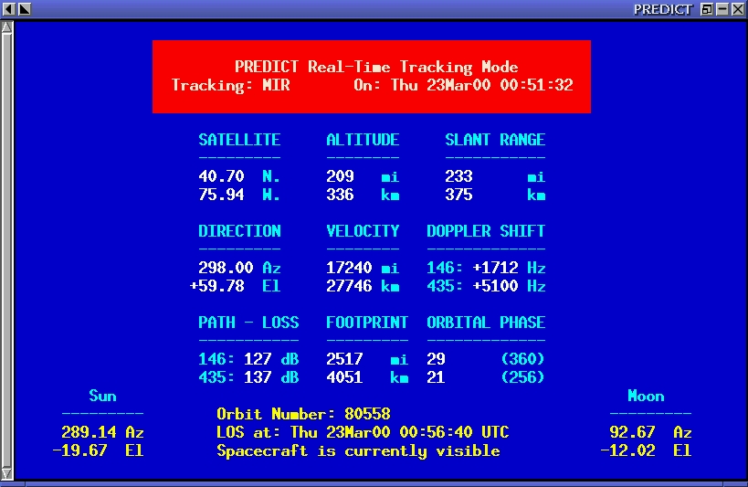 Once the program is built and installed, the user is asked to enter his latitude, longitude and altitude above sea level. A database of Keplerian orbital data is also required for the satellites of interest to the user. A database of amateur radio and several “high-interest” satellites is included with the program to get things started. Since the accuracy of Keplerian orbital data seldom remains high for long periods of time, facilities are included in the program to permit the database to be updated from more recent element sets. A simple shell script is included with the program to facilitate this update through an anonymous FTP connection to ftp.celestrak.com. This script may even be invoked through a crontab, permitting automatic updates of PREDICT's orbital database to take place on a regular basis without the need for user intervention.