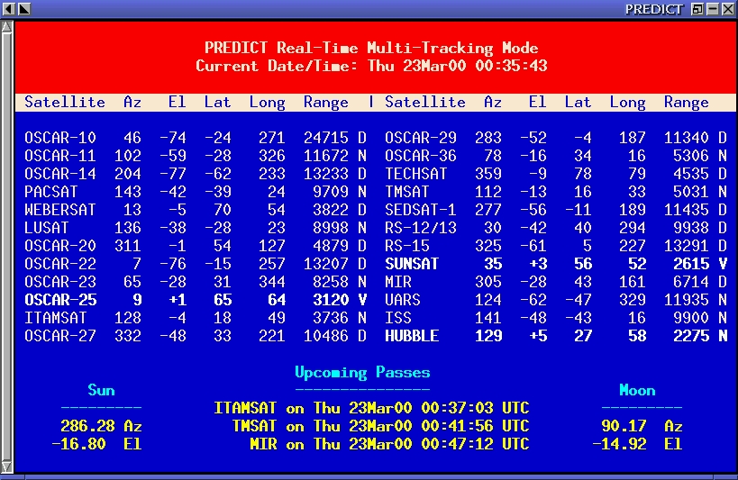 A multi-tracking mode that provides sub-satellite point, azimuth and elevation headings, sunlight and visibility and slant-range distance information for all 24 satellites in the program's current database on a real-time basis. Azimuth and elevation headings for the sun and moon are also provided, as a well as a listing of the AOS dates and times for the next three satellites expected to come into range of the ground station.