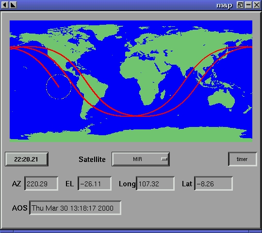 Since none of these spacecraft are in geostationary orbit, some form of tracking and orbital prediction must take place before radio contact may successfully occur. PREDICT provides all the information needed to predict passes of these spacecraft over a particular ground station location, and track them in real time once they have arrived. A graphical orbital-display program operating as a socket-based client of PREDICT is shown in Figure 6. The footprint as well as several consecutive orbits of the Mir space station are shown on the map.