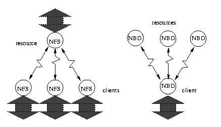 NFS provides a star configuration, with the server at center (left). NBD, with the help of internal or external RAID, provides an inverted topology with multiple servers and a single client.