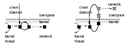 Pavel's original driver code comprised two major threads within the kernel. The “client” thread belongs to the client daemon. The daemon's job is to initiate the network connection with the server daemon on the remote machine, and hand down to the kernel via an ioctl call the socket it has opened. The client daemon then sits blocked user-side in an ioctl call while its thread of execution continues forevermore within the kernel. It loops continuously transferring data across the network socket from within the kernel. Terminating the daemon requires terminating the socket too, or the client daemon will remain stuck in the loop inside the kernel ioctl.