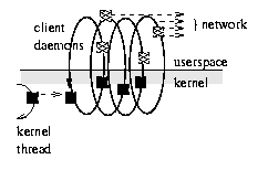 The client-side control flow in the original kernel driver is shown schematically on the left side of Figure 4. The black rectangle represents a request. It is linked into the device's request queue by a kernel thread and is then swept up in the client daemon's perpetual loop within the kernel. The client thread performs networking within the kernel. In the drivers we have subsequently developed, we have come to favour user-side networking, in which the client thread deals user-side with a copy of the request transferred from within the kernel. It dives repeatedly into the kernel to copy across the data, then transmits it in standard network code. The overheads are much greater, but the flexibility is also much greater. The overhead can be ameliorated by transferring multiple requests across at a time, and our current drivers do this. Normally, 10 to 20 requests of one block each will be transferred in each visit to the kernel. The cost of copying between kernel and user space cannot, however, be avoided. Multiple client daemons contend for the kernel requests as the clients become free, transferring them across the network through possibly distinct routes and physical devices. The situation is depicted in Figure 4. Each client daemon handles one channel, but will mediate any request. The channels provide redundancy, resilience and bandwidth.