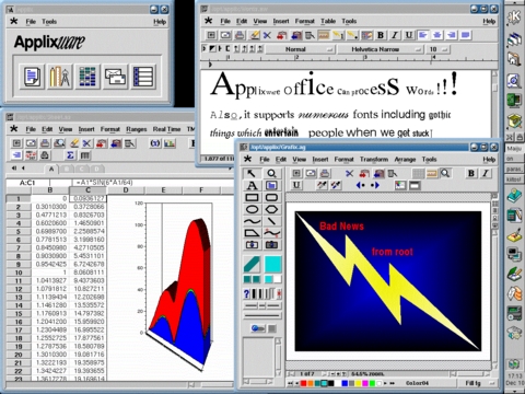 A key element of Applixware Office is ELF, the Extension Language Facility, a scripting language with interactive interpreter, compiler and debugger. The idea is to allow rapid prototyping, so there are over 3,300 macros included, as well as typical user-interface design tools such as a menu editor, bitmap editor, drag-and-drop/dialog editor, a TCP/IP socket interface and an SQL database interface. Applix says the Applixware Office suite is written largely in ELF, so clearly it's capable of something. Although it was once proprietary, ELF has been detached from Applixware and is available under LGPL as SHELF. Inside of Applixware, the giant advantage of ELF is that it rapidly allows users to extend the functionality of the suite. Businesses each have their own peculiar demands, and this kind of flexibility and extensibility is said to have popularized Applixware. ELF is a composite of Elisp and BASIC (sounds promising, eh?), but apparently ELF is more like an evolved awk or sed.
