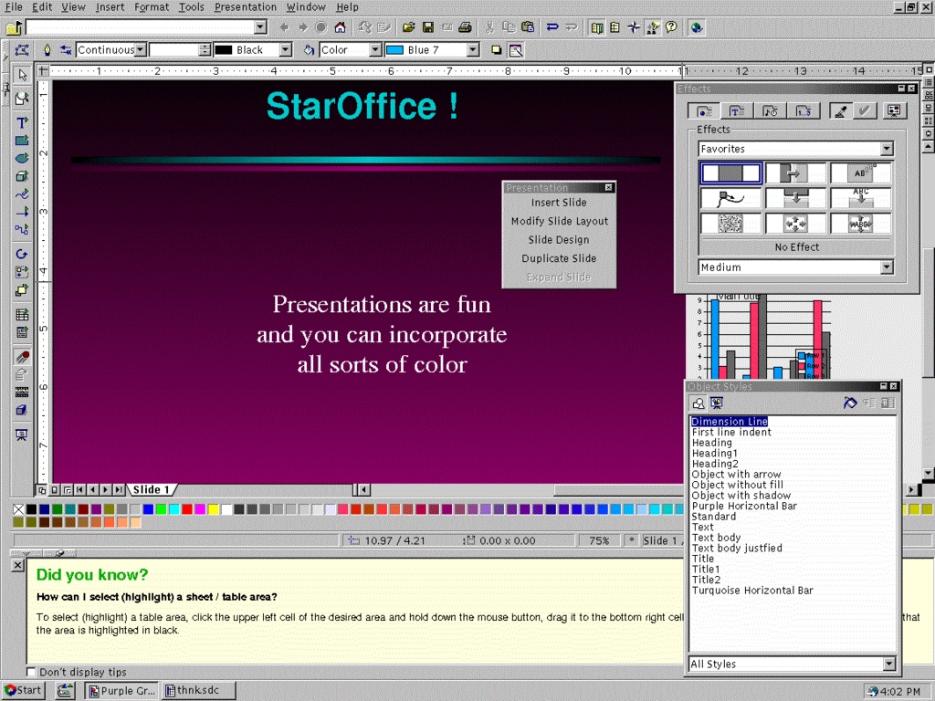 Presentation software is important for people who make presentations. If you are one of these people, you can use one of these packages. As is typical in the Applixware/StarOffice comparison, Applixware is simpler while StarOffice is more thorough. I found Applix Presents to do well for informal affairs (probably just on account of the nature of its templates), while StarImpress would be better suited for formal presentations, although this is a bit categorical. StarImpress has a nice collection of templates and a well-designed drawing program, so with some resourcefulness, you can put together quite a decent presentation. Applix Presents will also do for most circumstances and it's quite easy to use, but seems a bit less flexible and the included templates are not as beautiful. Since presentation software is so bureaucratic and businesslike, it fits in with the office-culture scene, but I have my doubts as to its value. Still, it's fun to play around with.