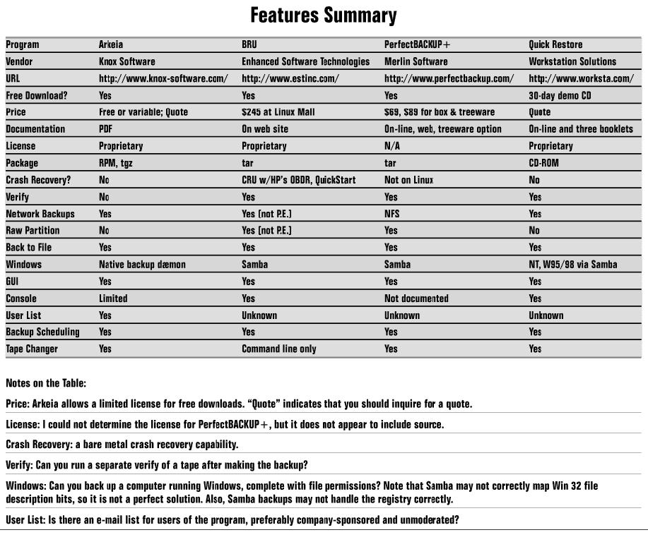 Four backup programs for Linux are reviewed below: PerfectBACKUP+, Arkeia, BRU, and Quick Restore. The first three are available on the Web. Arkeia comes packaged with Red Hat, Mandrake and SuSE distributions of Linux. Quick Restore is available on CD only.