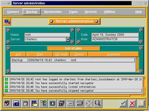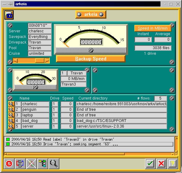 Next in line is Arkeia, from Knox Software. Arkeia has a three-part design. The server resides on the machine to be backed up, and writes the backup with local file permissions and bits. The server backs up and restores files; the client runs one or more tape drives on a machine; and the user interface provides user control over the other two parts. The user interface comes in two flavors, command line and GUI.