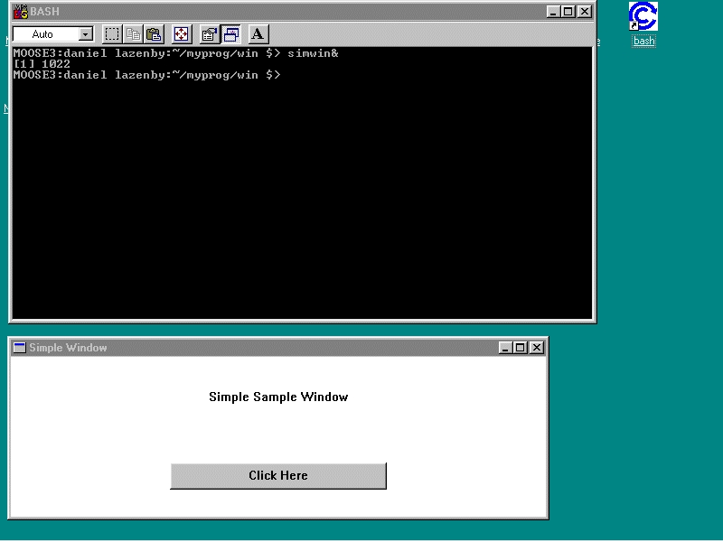 Simwin.c contains code for a simple no-frills window. Compiling from the command line performed well. Issuing the simwin.exe command at the bash shell prompt caused the sample window to appear on the desktop as though it belonged there (see Figure 2). Resource files and DLLs are required to compile more robust Windows applications. Cygwin includes the capability to use custom resource and DLL files. The documentation briefly highlights building and linking to DLL and resource files. I am not a Windows developer, therefore, I was not able to exercise some of Cygwin's Windows compiling features seriously.