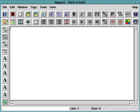 Both of these editors allow you to work on multiple files at the same time. They both provide buttons to insert basic HTML tags such as headings, lists and text attributes. Bluefish uses a tabbed menu, which allows more tag selections via pushbuttons (see Figure 1) while August has a single push-button menu and uses drop-down menus for selecting other functions (see Figure 2). This makes for a cleaner interface and quicker selection of basic HTML tags. Both of these editors let you preview web pages using Netscape, and August also allows you to preview your page using Lynx.