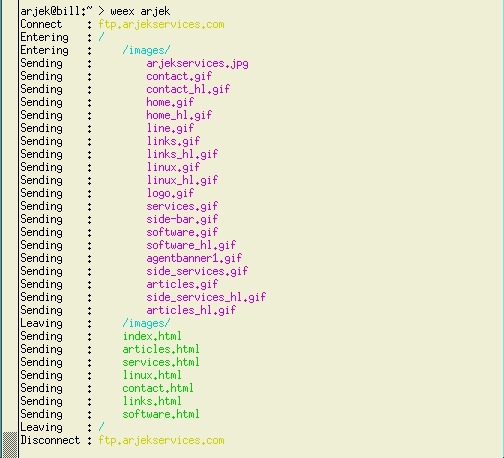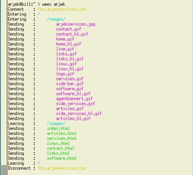 While I prefer the simpler command line and more colorful console output of weex, it does not always keep track of the files it uploads to subdirectories on the remote site. Consequently, it uploads some files again and again, even though they have not changed. It also seems to have problems when the remote system is running Windows NT, but after a bit of tweaking, I have gotten it to work.