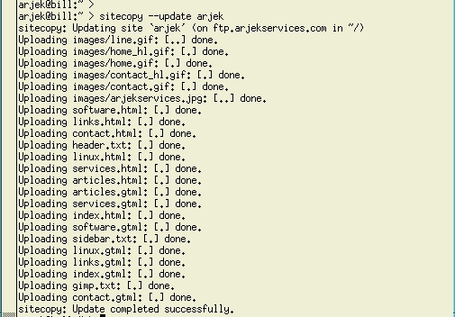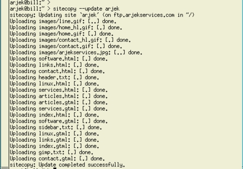 The console output of weex is more colorful and provides a bit more detail than that of sitecopy (see Figures 3 and 4). The weex command interface is also simpler: all you do is issue the weex command followed by the name of the site you wish to update. To run sitecopy, you issue the sitecopy command, followed by the action you wish to take (update, fetch, synchronize), followed by the site you wish to use. If you do not include an action command, sitecopy displays the files that are different between the local and remote directories.