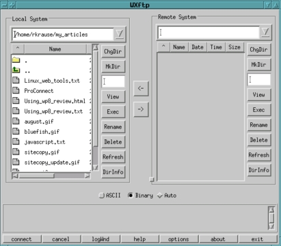 For copying files manually or creating the initial remote directory structure, I use WXftp. This program provides a graphical front end to the ftp command (see Figure 5). It also stores user information for sites, so you do not have to enter addresses, usernames and passwords manually (see Figure 6). You can also configure it to switch to specific local and remote directories for each site you maintain. In addition to copying files, you can create and remove directories, delete files and execute commands on the remote system. I have been using version 0.4.4 and had no problems with it.