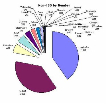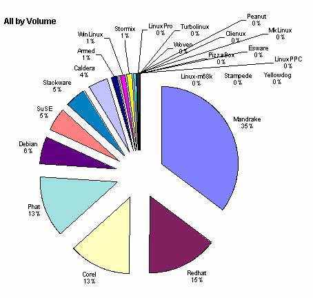 the Mandrake downflow from Tucows continues to be huge: still #1, though down 4% from January. Corel edged past Red Hat for #2, though both rounded to 17%. That's up 3% for Corel and down 1% for Red Hat. #4 Debian is up 2% and #5 SuSE is down 1%. Slackware was up 1%, Caldera held even, and Stormix showed up for the first time with a 1% wedge of the pie.