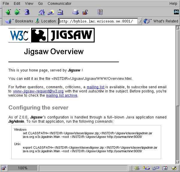To verify that the Jigsaw server is up and running, start your favorite web browser and point it to your workstation address at port 8001, which is the default port for the Jigsaw server. Et voilà! We get the Jigsaw server home page (see Figure 1), similar to the Apache installation home page.