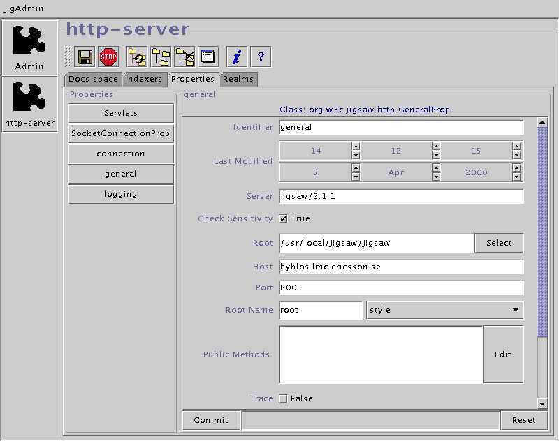 Jigsaw comes with an administration tool called JigAdmin. JigAdmin is a graphical interface that communicates with the JigAdmin Administration Server. This server can administer multiple Jigsaw servers running on the same machine, provided that those servers have been launched by the same Java Virtual Machine.