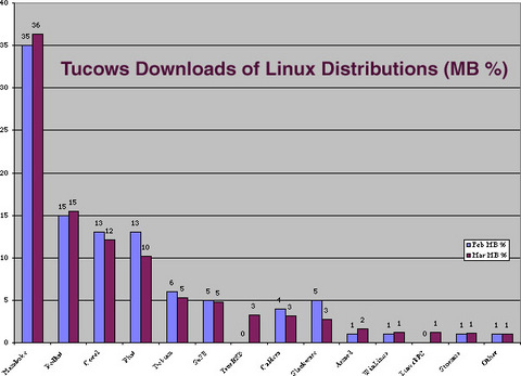 Mandrake held its number-one position in total downloads (measured in MB) from Tucows in March. Even though it's down a couple of points from its January high, it still accounts for over a third of the downloads total. Red Hat held even with 15% at #2. Corel slipped a point to 12% in the #3 spot. Phat Linux dropped three points, but still held the #4 position at 10%. Debian and SuSE follow with 5% apiece. The rest are between 3% and 1%.
