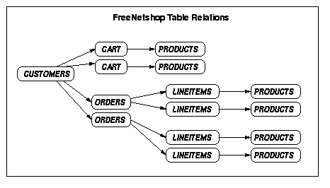 A view of the FreeNetshop table schemas reveals that the database has not been fully normalized. This decision was made to minimize table lookups at specific points in the application CGI programs. Of course, the effect of this decision is to sacrifice some small amount of storage space to achieve faster response. Figure 1 shows the table relationships. It can be seen that customers may have one-to-many and one-to-one relations with Cart and Orders. Orders, in turn, can have one-to-many or one-to-one relations with Lineitems. Lineitems and Cart are one-to-one related to Products. Products (i.e., a product record) will have a many-to-one relation with Lineitems and Cart, since one product number will be in multiple shopping carts and order line items.