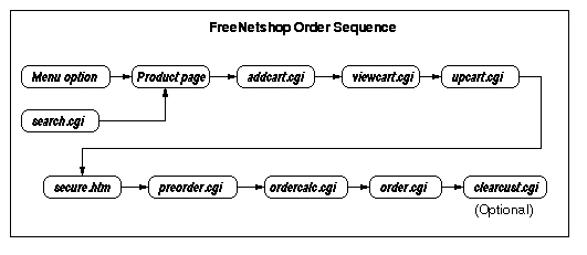 Customer-level programs are linked into the HTML pages and each other so that the process of adding items to the shopping cart and placing an order is completely menu-driven. Nevertheless, it may be useful for the hosting ISP or administrator to understand the ordering process as it relates to the cgi programs. The customer-level programs are search.cgi, addcart.cgi, viewcart.cgi, upcart.cgi, preorder.cgi, ordercalc.cgi, order.cgi, clearcust.cgi and account.cgi. Figure 2 shows the customer ordering sequence.